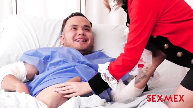 Beschreibung: Emily Thorne was doing her social work of cheering up the sick people in the hospital. She visited Elbertón, who was recovering from ligament surgery with which he would be able to stretch his arms. He got horny just seeing her, and she got horny seeing him horny.