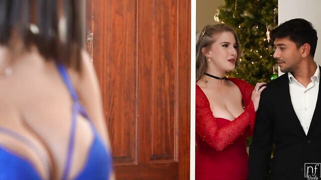 Beschreibung: Hailey Rose and her coworker Octavia Red are debating what to wear to the office Christmas party. Just as they're agreeing to try some clothes on, Hailey gets a text that Max Fills, their boss, is on his way to the party. Octavia suggest that Hailey have Max pick them up, and maybe they'll even be able to have some pre-party fun. Hailey agrees and texts her ask to Max.While they're waiting, the girls work together to slip into something sexy. Octavia slithers into a hot red dress that shows plenty of cleavage. Even as Octavia is complimenting Hailey's sexy bra and thong, they receive a notification that Max has arrived. Octavia tells Hailey that she'll go get Max and that Hailey should stay exactly as she is.Max is led in by Octavia and given no chance to protest when he realizes Hailey is wearing just lingerie. They swear they need his opinion about what to wear. As Max watches, the girls work together to dress Hailey in a super sexy dress that can't handle a bra. They spare him a wicket mutual smile and then come together to kiss one another before moving to the bed where Max is staring, stunned.When the ladies make their way over to Max, he's putty in their hands. The deliver one hell of a blowjob together, taking turns stroking and sucking as they keep eye contact between themselves. Gradually the girls undress down to their thongs, leaving themselves topless to take turns titty fucking their boss.Octavia takes the first go on the dong, straddling Max's hips and sliding down in cowgirl. Meanwhile, Hailey mounts Max's tongue so he can eat her pussy as he fucks Octavia. Turning around, Octavia continues in reverse cowgirl with Hailey rubbing her clit to make her moan nice and loud. Haily gets her own ride on the D as she takes Max for all he's worth in reverse cowgirl.Next up is a dicking down in doggy as Octavia takes her knees between Max and Hailey. Hailey gets her pussy licked and fingered as Octavia moans and rocks back against Max's strokes. When Octavia crawls forward to lay on top of Hailey, Max goes low to fuck Hailey while Hailey suckles Octavia's titties.Pulling out just before he cums, Max covers Hailey's big naturals with his juices. The girls enjoy the cum together, with Octavia taking a mouthful to share with Hailey. Finally sated, they agree that their bedroom party is better than a company Christmas party.
